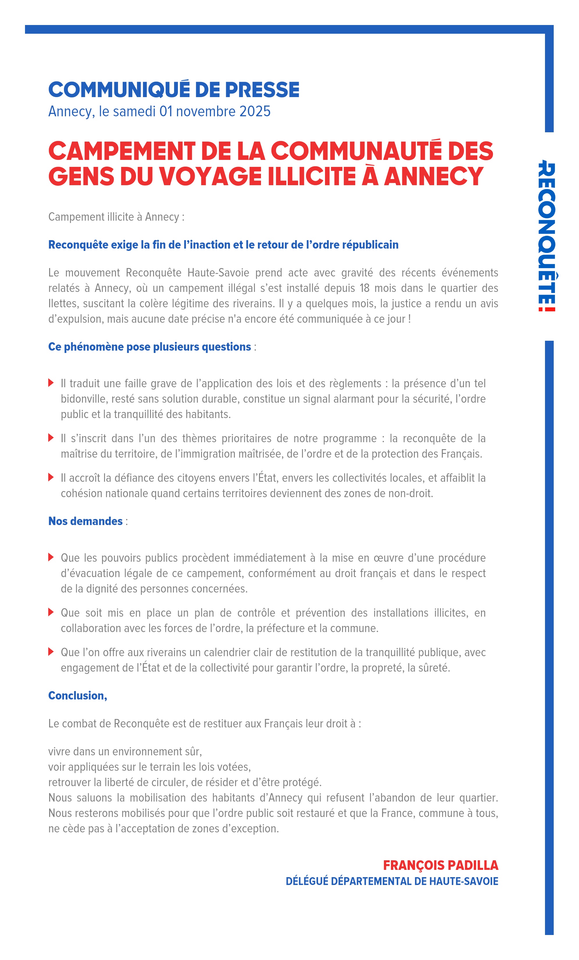 Le mouvement Reconquête Haute-Savoie prend acte avec gravité des récents événements relatés à Annecy, où un campement illégal s’est installé depuis 18 mois dans le quartier des Ilettes, suscitant la colère légitime des riverains. Il y a quelques mois, la justice a rendu un avis d’expulsion, mais aucune date précise n'a encore été communiquée à ce jour !
