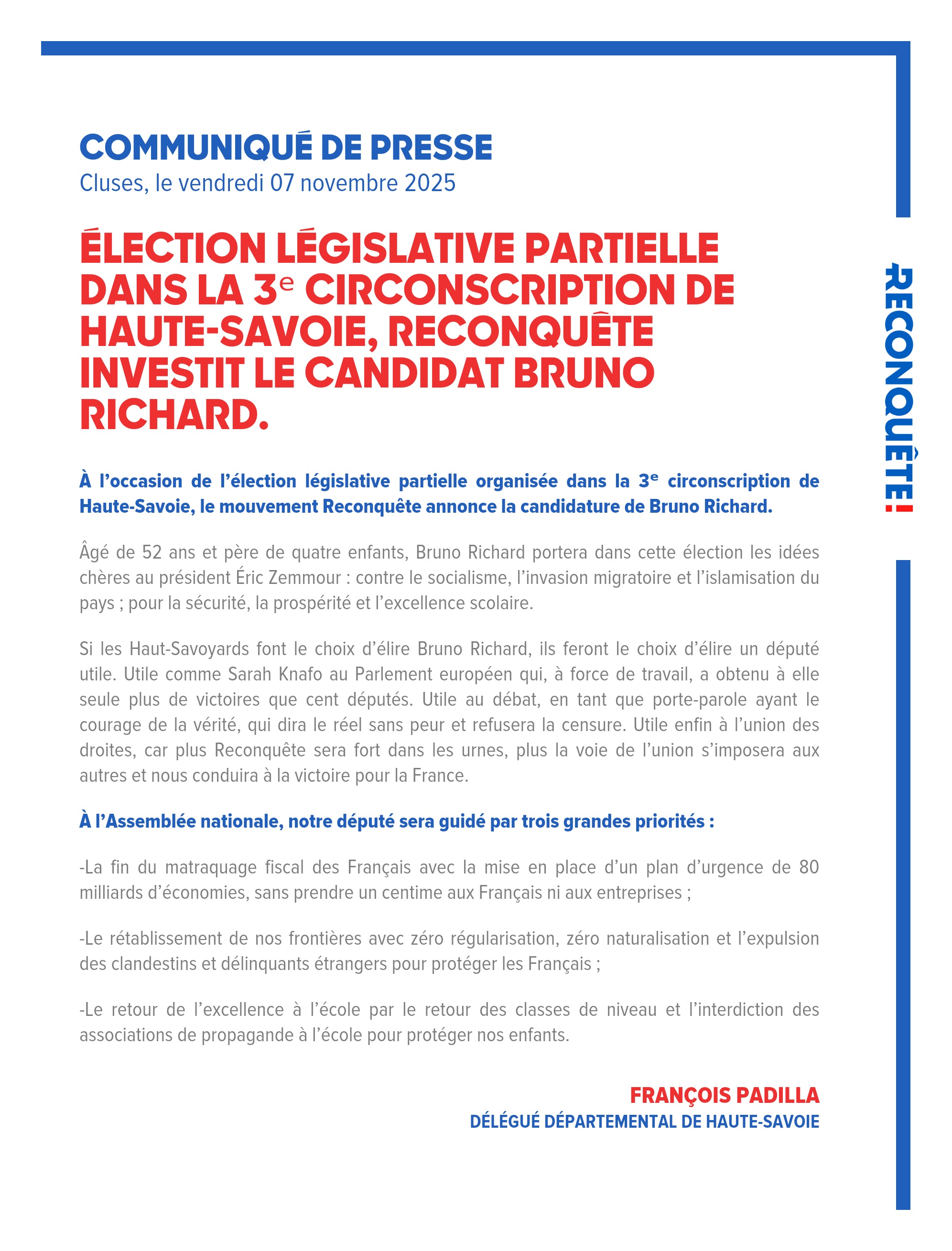 À l’occasion de l’élection législative partielle organisée dans la 3ᵉ circonscription de Haute-Savoie, le mouvement Reconquête annonce la candidature de Bruno Richard.