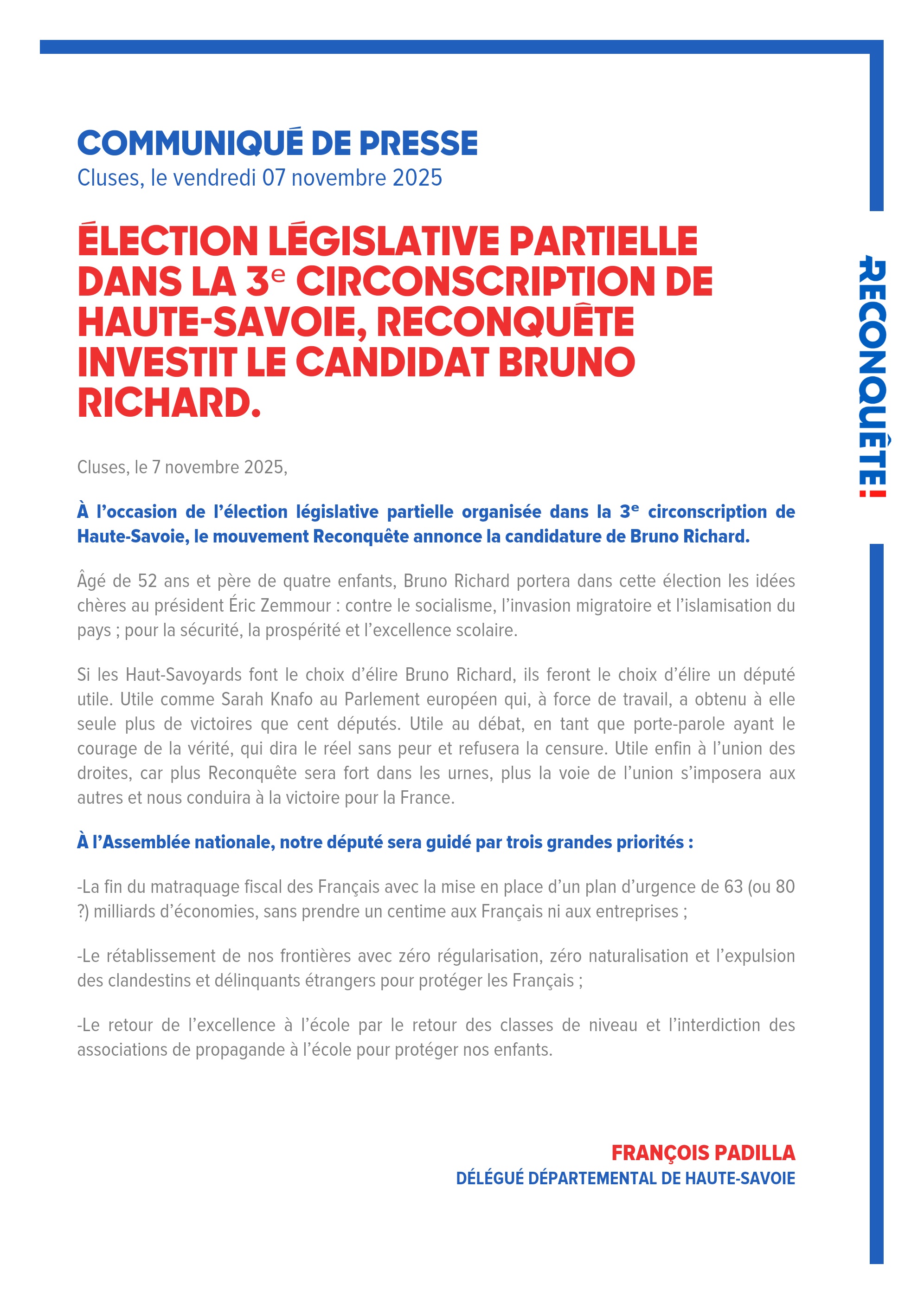 À l’occasion de l’élection législative partielle organisée dans la 3ᵉ circonscription de Haute-Savoie, le mouvement Reconquête annonce la candidature de Bruno Richard.